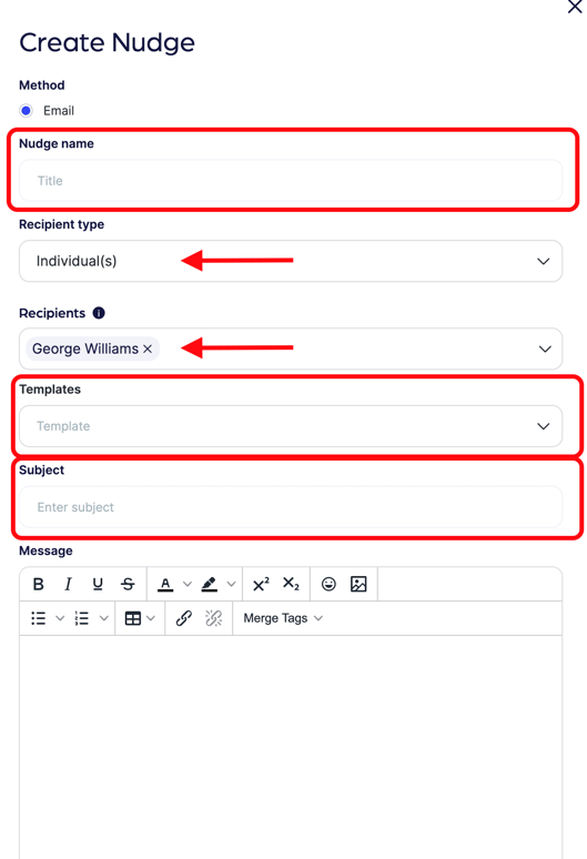 - Subject & Message - Once you have selected a template, this will be pre-populated with the Subject line and Message copy that form part of your chosen Nudge template. This information, such as the body or the message or subject line, can be edited in-situ