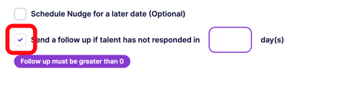 - There is also an option to specify a number of days for a follow up Nudge to be sent if the talent hasn’t responded. Simply check the box next to ‘Send a follow up if talent has not responded in __ day(s)’ and type in the number of days