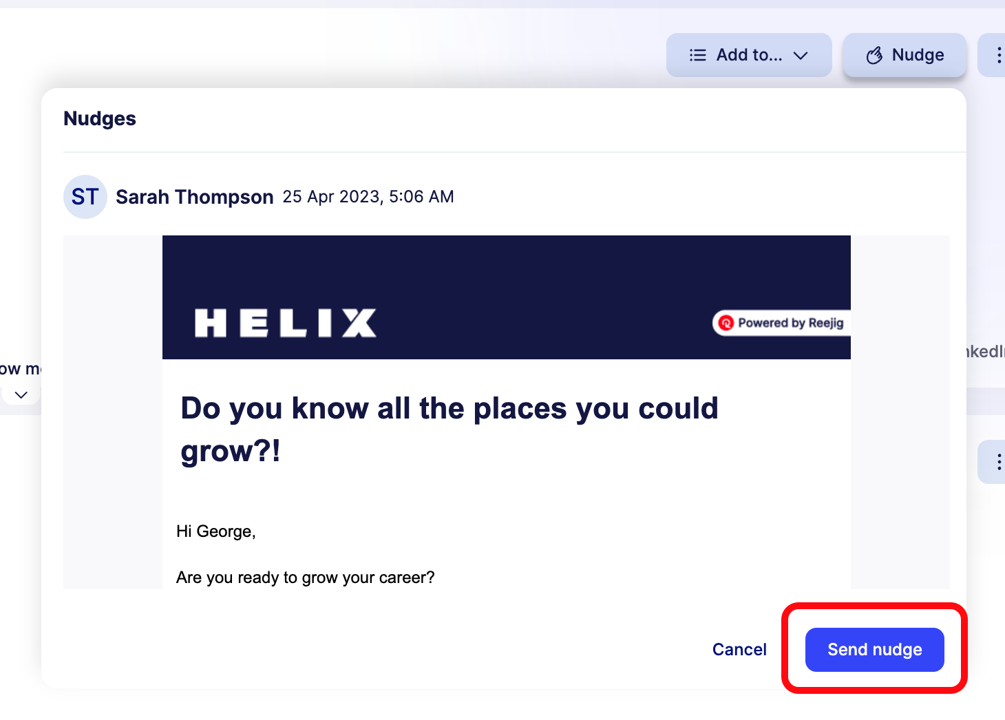 - From the Nudge menu, you'll be able to view any recent nudges sent to that candidate, and can start a new one by clicking the Send Nudge button.