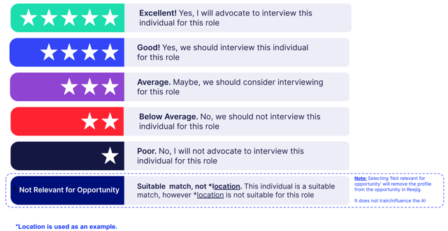 By rating a profile as a four or five star, Reejig will take note of the profiles attributes and learn that this is a what a good fit looks like for the requirements of that opportunity.