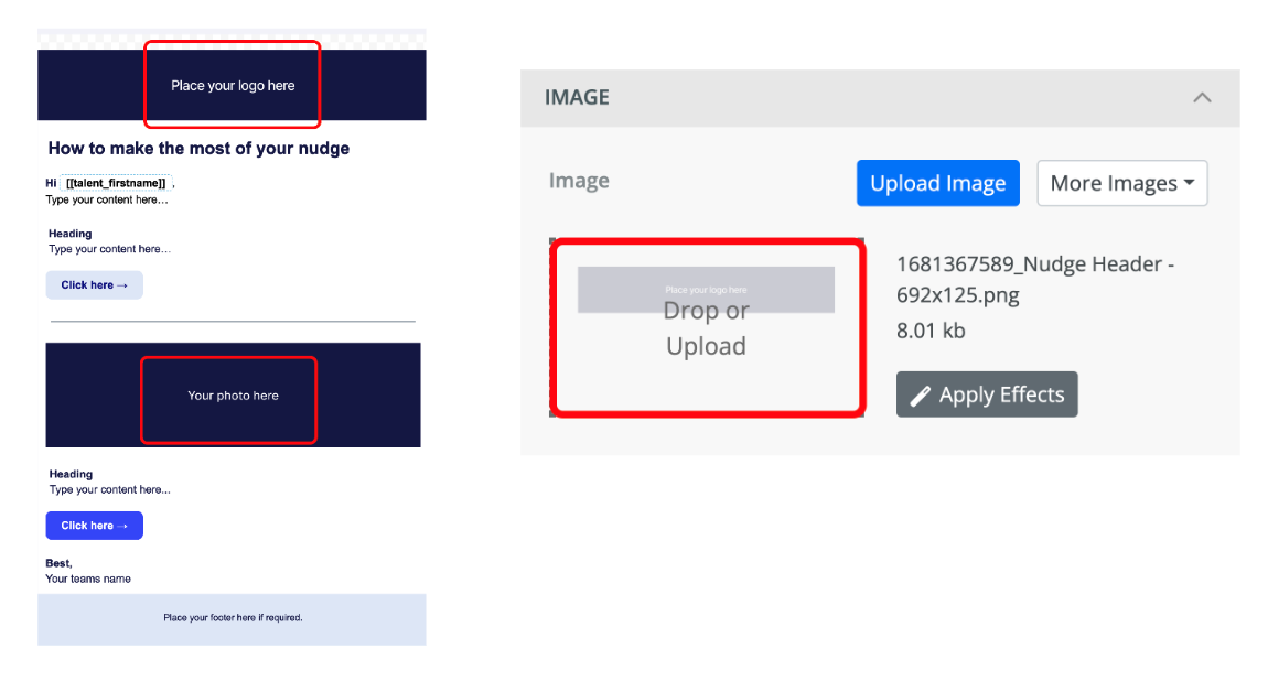 - Add imagery into the Nudge template by clicking on the areas that say, ‘Place your logo here’ and ‘Your photo here’.