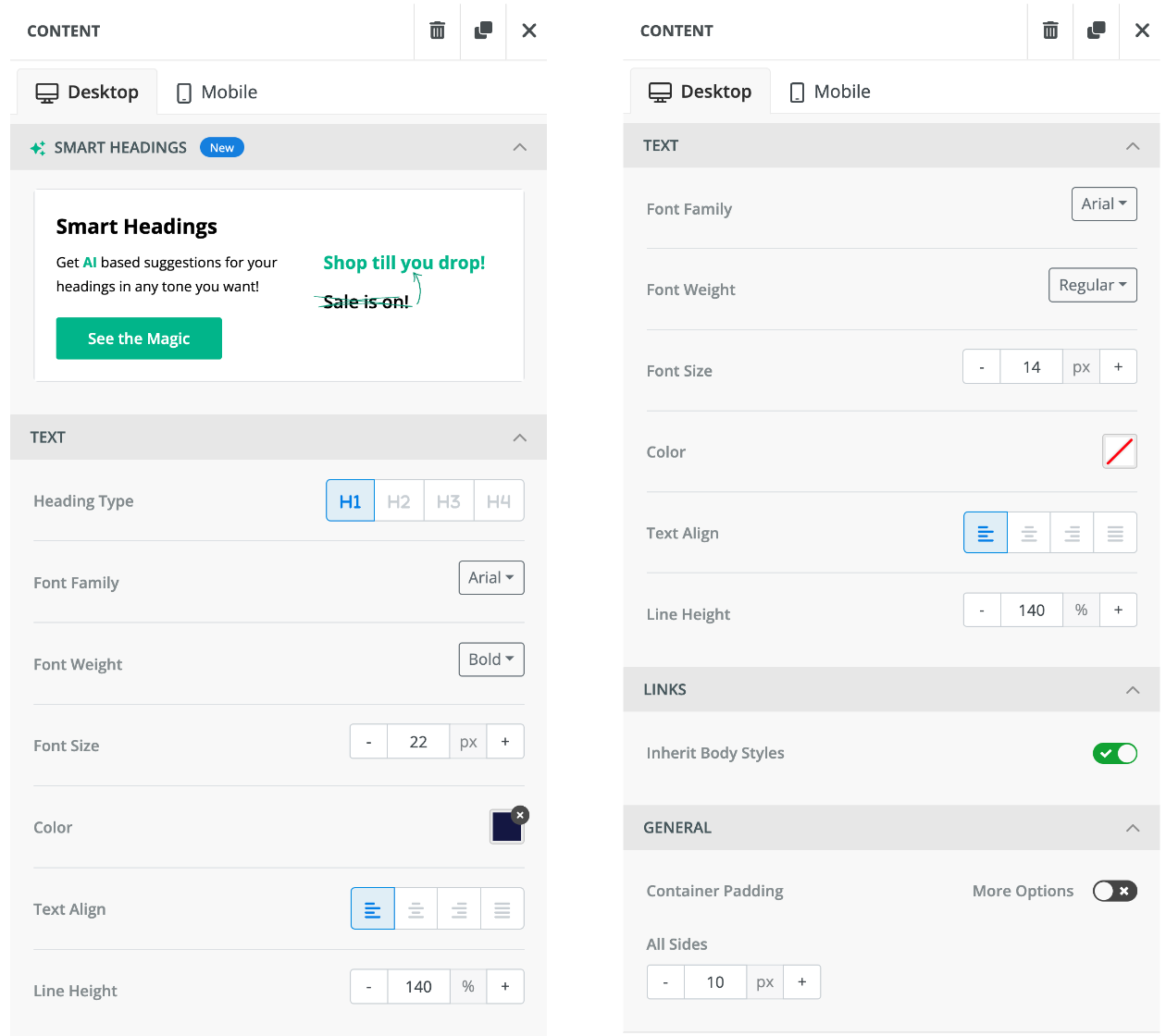 - You can preview your template in either Desktop or Mobile mode by selecting the tab in your ‘Content’ window