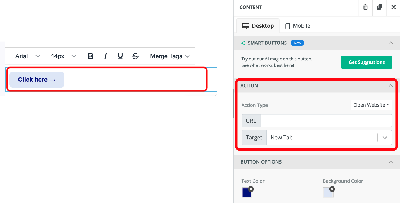 - Click in the ‘button’ section of the template to create a call to action and a redirect to a chosen webpage or URL