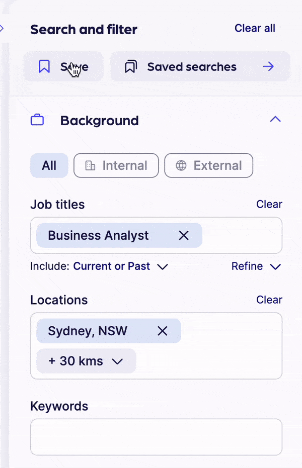 Once you’re happy with the filters, you can click ‘save’, which saves your search and makes it accessible when clicking, "Saved searches."