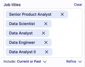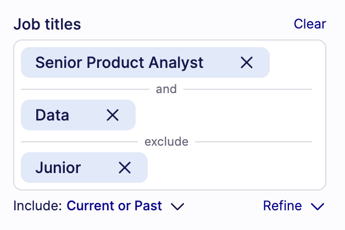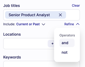 - AND: will narrow the search by requiring all results to have BOTH inputs. e.g. talent must have both “Senior Product Analyst” AND “Data” in their job titles.