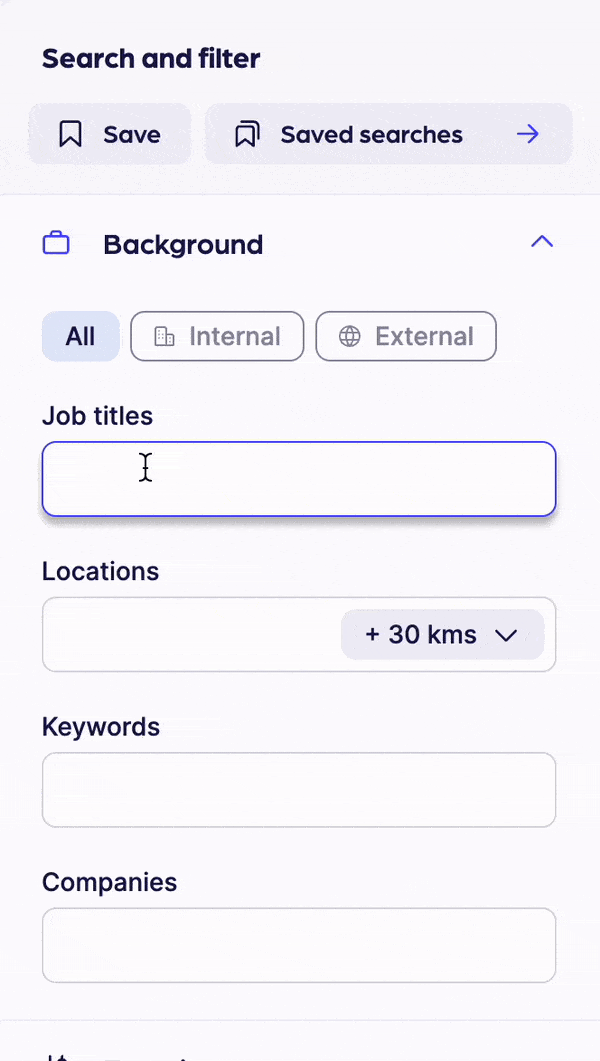 Simply start typing in your first search into fields like job title, location and companies. These fields all have autocomplete enabled, helping you save time and catch spelling mistakes. As you type, results will start to display in the flyout. Select the option you’re looking for by clicking on it in the list or hitting ‘enter’ when the option you seek is highlighted in purple.