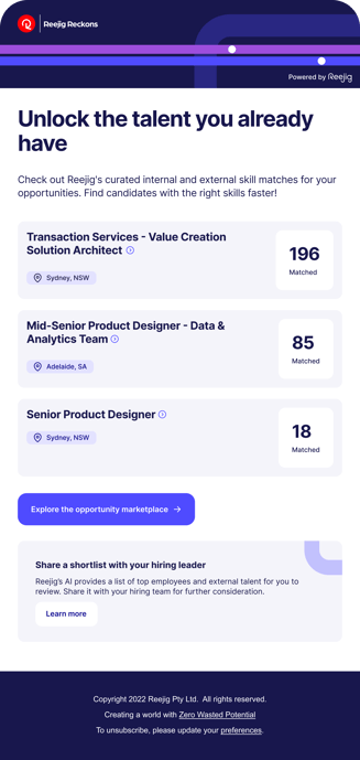 These daily hooks let Reejig users (who are owners of opportunities) know how many profiles are being matched against their opportunities so they can quickly jump into roles that have had recent activity or have strong match lists to review.