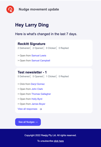 These weekly hooks remind users of the nudges they have sent during last 30 days, and summarise the most recent events happened on these nudges during last 7 days. This can help the user decide to re-engage the nudge campaign population, change the message, or refocus the audience.